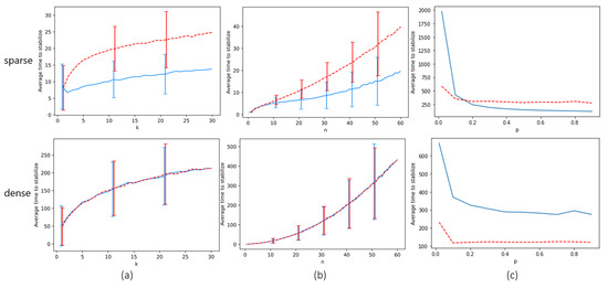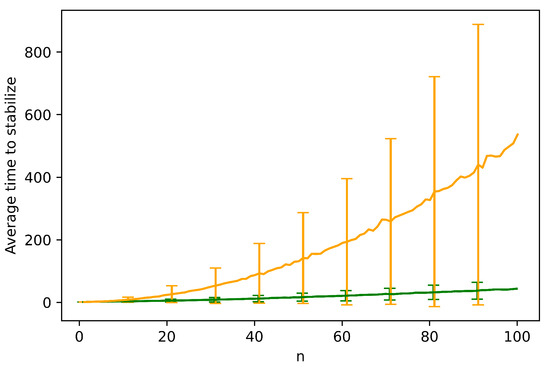 To finish this section, we also verify the bounds of Theorem 1 by numerical simulation, by fixing and measuring as n goes from 1 to 100—see Figure 7. We again measure both sparse and dense configurations (i.e., and , respectively). The average expected time appears asymptotically bounded by , as expected. We also simulated the asymptotic worst-case locust configuration in the proof of Theorem 1 (not illustrated in Figure 7) and confirmed its stabilization time is asymptotically , verifying that the bounds of Theorem 1 are asymptotically tight.