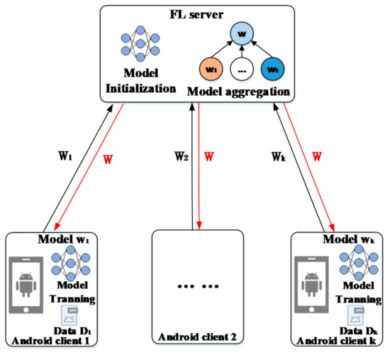 To solve these privacy concerns, we introduced an FL framework and developed a privacy-protected collaborative classification model for Android malware. An FL framework allows Android clients to keep the malware dataset locally and collaboratively learn classification models, which means that any third party cannot access the user’s raw data [28]. The framework of Federated learning consists of a server and multiple clients [29]. The server in this work refers to the remote FL server, and the client is an Android client.