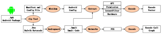 In contrast, the method based on static features does not need to run the app for behavior checking. Static features can be obtained simply by analyzing an Android Application Pack (APK). Opcode [11], permission requirements, intent actions, and APIs, as the most common low-level static features, are widely used in Android malware detection. Arp [12] proposed DREBIN, which uses Android permissions and sensitive APIs for extensive static analysis. DREBIN is a lightweight method that detects malware on smartphones. In [13], Android malware is classified using n-gram features of operation sequences. However, this approach is not robust against obfuscation because the opcode sequence can be modified easily. In [14], the authors suggested a highly efficient method to extract API calls, permission rate, surveillance system events, and permissions as features. They constructed a model based on ensemble Rotation Forest to identify whether an app is malicious or benign.