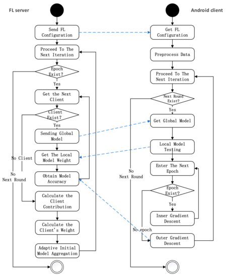 In the initialization phase, the FL Server assigns a pre-trained global model . to each Android client. Then, each client trains and improves the current global model by using the local dataset of size in each iteration.
