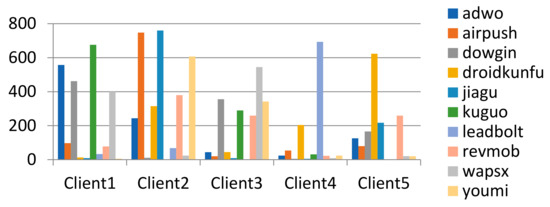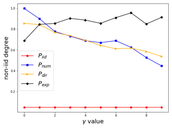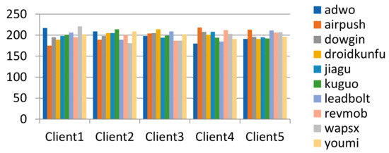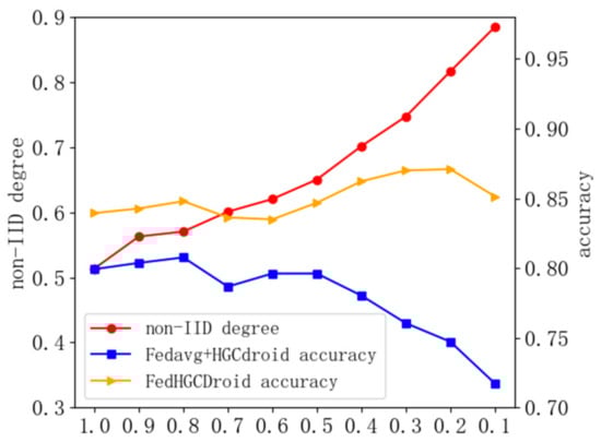 As shown in Figure 16, the abscissa represents the γ parameter. The ordinate represents the degree of non-IID of the current scene and the accuracy of the classification of the model (the task of malware family classification). Different parameters are set to obtain different degrees of non-IID partition results, and the classification accuracy of the model is obtained through experiments. The experimental results show that the classification accuracy of [Fedavg + HGCdroid] decreases with the increase in non-IID degree. However, the accuracy of the FedHGCDroid model is basically stable and improved to a certain extent, which further indicates the superiority of FedHGCDroid (FedAdapt) in adaptive performance, so that it can better handle the scenarios with non-IID distribution on the client.