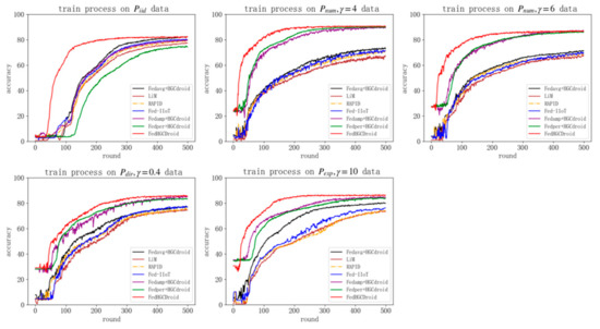 All algorithms take the same federated learning settings. A total of five clients were set, with iterations of 500, a client epoch of 5, a batch size of 128, a learning rate of 0.01, an optimizer of SGD and a learning rate of 0.01.