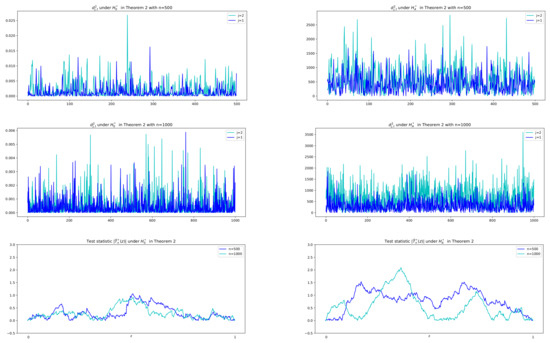 As for the CUSUMSQ test in Theorem 2, Figure 6 describes series of difference squared, , and test statistic values in absolute, , under the two hypotheses with , respectively. It is shown that under , the difference series has small variance with small values whose squares are less than 0.025 for and 0.006 for , whereas under it has large values with their squares between 0 and 2500. Therefore we adopt the idea of change-point test of variance to the difference series , which yields a solution of the existence of the exponential decay rate.