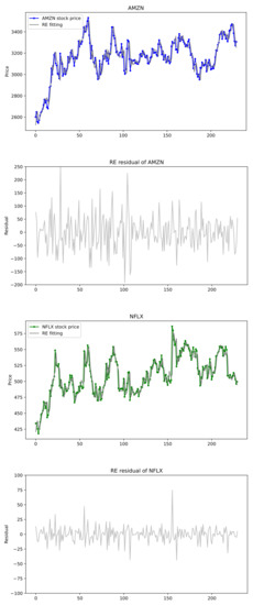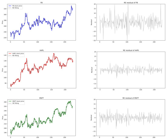 Table 10 reports the performances of the HAR(3,3) models for (FB, AAPL, MSFT). The conventional HAR(3,3) model has 30 parameters, whereas the exponential weighted HAR(3,3) model has 15 parameters. The decay rate estimates of (FB, AAPL, MSFT) are , from which Exp. HAR(3,3) models are fitted in Figure 8. As seen in Table 10, our proposed model performs better than others with respect to the RMSE, MAE, and AIC whereas the univariate HAR model with LASSO has good performance on BIC, which are indicated by bold numbers in Table 10. Consequently, the proposed model not only has fewer parameters than the conventional HAR models, but also yields the best performance on the loss errors such as RMSE and MAE. The exponentially weighted HAR model with decay rates is suitable for the stock prices of joint financial assets with strong cross-correlation, rather than the volatility, in the stock market.