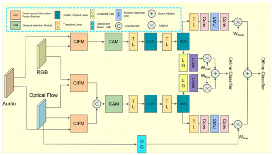 The cross-modal information fusion module (CIFM) integrates the features of different combinations and weights them to capture the cross-modal information in audio and video. As shown in Figure 1, for the inputs of OAMFN, we denote as RGB features, as optical flow features, and as audio features, where T is the length of the feature matrix, D is the dimensions of the RGB features and the optical flow features, and is the dimensions of the audio features.