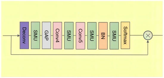 where denotes the transposed convolution, which can enrich the information of the feature map. In the transposed convolution layer, the kernel size is nine, the stride is three and the padding is four. To soften the input feature , we add an SMU layer after the transposed convolution layer.