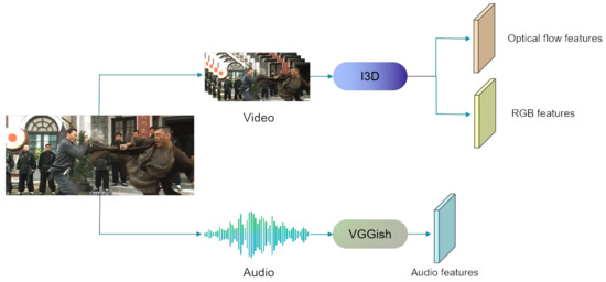 XD-Violence [22] is the only existing violence detection dataset including audio, optical flow, and RGB modals, and it is the largest-scale public multi-modal dataset, having a total of 217 h at present. Among them, the training dataset contains 3954 videos, and the test dataset contains 800 videos. It is collected from CCTV cameras, hand-held cameras, car driving recorders, etc. It provides more than eight scenarios and six types of violent events, and each violent video includes multiple violent labels . As shown in Figure 3, the feature extraction module [22] includes two branches: visual and audio. The visual branch extracts RGB features and optical flow features from the I3D [43] network, and the audio branch extracts audio features from the VGGish [44,45] network.