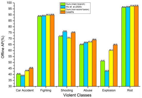 To verify the AP performance of our method on all kinds of violence videos, we select 30 videos from each of the 6 violent classes (i.e., abuse, car accident, explosion, fighting, riot, and shooting) on the XD-Violence dataset for testing. As shown in Figure 4, our OAMFN method is superior to that of Wu et al. [22] in five violent classes, evidently lifting the AP performance by 6.43% to 22.03% in violent classes with large changes in optical flow, such as car accidents and explosions. Compared with the AP performance of our main branch (RGB and audio features as input) and Wu et al. [22], the AP performance of our non-score fusion framework shows that the addition of optical flow features has effectively improved the detection accuracy, and our optical flow-aware-based score fusion strategy can further improve the detection accuracy in five violent classes (i.e., abuse, car accident, explosion, fighting, and riot). Our OAMFN method is slightly lower in the shooting class because, in videos with weak action or short duration, the change in optical flow is very small. Comparing our main branch with our non-score fusion framework, the AP result shows that the addition of optical flow features reduces the detection accuracy. However, our optical flow-aware-based score fusion strategy improves the detection accuracy by 4% after controlling the contributions of three modals. Hence, our experimental results indicate that the addition of optical flow features can improve violent classes with poor AP performance, such as car accidents and explosions. Additionally, the optical flow-aware-based score fusion strategy can further improve the detection accuracy.