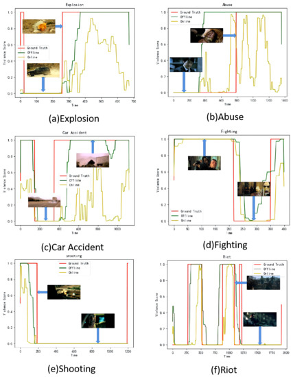 Figure 5 demonstrates the violence score curves produced by our OAMFN method in different testing videos from the XD-Violence dataset. We select six violent classes (i.e., explosion, abuse, car accident, fighting, shooting, and riot) on the XD-Violence dataset for testing. As shown in Figure 5, the rise in violence scores means the emergence of violence. Our method can clearly separate violent fragments from non-violent fragments in five violent classes (i.e., car accident, explosion, fighting, riot, and shooting). Our OAMFN method is less effective in terms of the AP performance of the abuse class because this class shows no obvious violence in the audio modal, the optical flow modal, and the RGB modal.