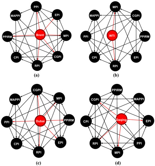 where V represents the node set, and E and W represent the edge set and weight set, respectively. If does not equal 0, then there is an edge from variable i to j. Since the weights of the edges vary over time, we only display the unweighted transmission networks of four oil price shocks to various price indices, as shown in Figure 1. The directional red lines represent the transmission relationships from crude oil price shock to price indices, i.e., the direct impact from crude oil to price indices. It is observed that not all the price indices could be directly affected by crude oil. Furthermore, the transmission relationships among price indices are complicated.