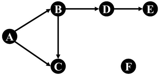 In this paper, we explore the indirect effect of crude oil price shocks on Chinese price level based on the TNOP. Since the sample data are monthly data, this paper assumes that the transmission of price shocks between two variables needs one month. Figure 2 is a simple transmission network. There is an edge from A to B and from A to C; thus, the price fluctuations of A could be directly transmitted to B and C in the first month after A is shocked. Due to the transmission relationships from B to C and from B to D, the affected B could further impact C and D; thus, there is an indirect impact from A to C and from A to D in the second month after A is shocked. Similarly, the influence of the price fluctuations of A could indirectly impact E in the third month. Thus, the indirect effects arise from the second month after a onetime positive shock to A. Furthermore, there is no transmission path from A to F; thus, the price fluctuations of A could not affect F.