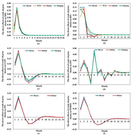 Third, crude oil can also be industrially fractionated into refined oil products that can be directly consumed by consumers. When the price transmission mechanism is unobstructed, the influence of crude oil price fluctuation could transmit from upstream to downstream; that is, the consumer market could be directly affected by crude oil price fluctuations. However, based on the Granger causality test, the causal relationships from crude oil to CPI are not statistically significant, proving that the fluctuation transmission of crude oil prices is not smooth. This might be because the Chinese government formulates a pricing mechanism for refined oil products and takes a series of measures to stabilize the consumer market, decreasing the impact of crude oil price shocks on CPI. From Figure 3b, it is observed that the shocks of four crude oil prices could be transmitted to RPI. The responses of RPI are larger in the first two months, after which the responses decline sharply and fade away over time. The direct effects are significant until the sixth month.