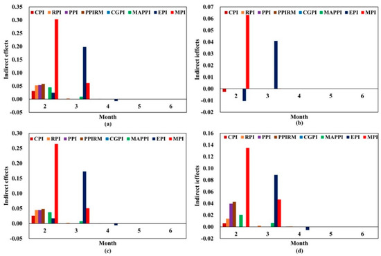 For MPI, the indirect impacts of oil price shocks are positive (Figure 4). The indirect impacts of Brent, WTI, Dubai, and Daqing reach a peak of 0.3031, 0.0630, 0.2646, and 0.1348, respectively, in the second month, meaning a positive shock of one standard deviation in the four crude oil prices has an indirect positive impact on MPI in the second month, with values of 0.5469, 0.3875, 0.4772, and 0.4654, respectively. The indirect impact could last for only two months. For EPI, in the second month, the impacts of Brent and Dubai are positive, while the impacts of WTI and Daqing are negative. The indirect impacts of four kinds of crude oil price shocks are positive in the third month with a peak of 0.1981, 0.0409, 0.1729, and 0.0887, respectively. However, the indirect impacts turn negative in the fourth month, after which the impacts die out.