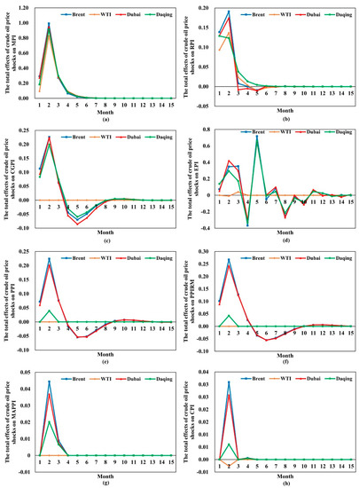 The total impact of crude oil price shocks on price indices. (a–h) represent the total effects of crude oil price shocks on MPI, RPI, CGPI, EPI, PPI, PPIRM, MAPPI, and CPI, respectively.