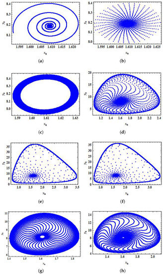 - Liu, X.; Xiao, D. Complex dynamic behaviors of a discrete-time predator-prey system. Chaos Solitons Fractals 2007, 32, 80–94. [Google Scholar] [CrossRef]