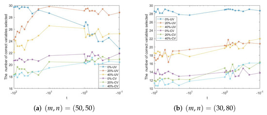 (4) Noting that the TGL model with different parameters t has great differences in the variable selection results, we further conduct some simulation studies to investigate the influence. Figure 1 shows the variable selection results of different parameters t ranging from to . We can see that the satisfying performance can be achieved when the parameter t is near . It does not turn out well when is too large. This coincides with our previous discussion that is strongly convex with limited t.