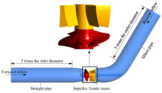 In this study, a bidirectional axial-flow pump with an arc-shaped impeller was used, as shown in Figure 1. Except for the impeller, the two kinds of axial-flow pumps were the same in that they contained the same straight pipe, guide vanes, and elbow pipe. Figure 2 shows a comparison of the arc- and S-shaped impellers both based on five airfoils. The blade number, diameter, and tip clearance for the two impellers were 3, 300, and 0.2 mm, respectively. The blade number and hub diameter of the guide vanes were 5 and 120 mm, respectively. Further main design parameters for the two bidirectional axial-flow pumps are listed in Table 1.