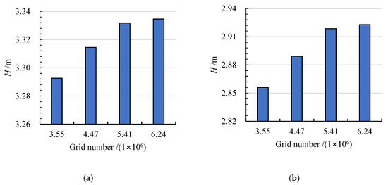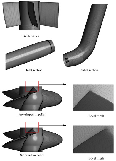The computational domains of the two bidirectional axial-flow pumps were discretized by a hexahedral mesh. As shown in Figure 3, ICEM CFD was used to generate meshes for the straight and elbow pipes. TurboGrid was applied to create meshes for the arc-shaped impeller, S-shaped impeller and guide vanes. The average Y+ values of the straight pipe, arc-shaped impeller, S-shaped impeller, guide vanes, and elbow pipe were 27.9, 23.3, 24.6, 11.2, and 33.3, respectively, which met the requirements of the SST turbulence model [26]. The grid numbers of the two bidirectional axial-flow pumps were determined by grid independence analysis, as shown in Figure 4. Since the total grid nodes exceeded 5.41 million, the forward and reverse design heads’ relative growth rates for the arc-shaped impeller case were less than 0.02% and 0.17%, respectively. Accordingly, the number of grid nodes of the straight pipe, arc-shaped impeller, guide vanes, and elbow pipe were determined to be 909,706, 2,079,720, 1,478,235, and 950,172, respectively. To ensure that the number of nodes would not affect the comparison of the two impeller cases, the number of grid nodes for the S-shaped impeller was calculated as 2,279,160.