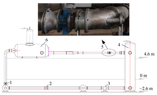 Structure of the test bench (1: butterfly damper, 2: electromagnetic flowmeter, 3: circulating pump, 4: high-pressure tank, 5: bidirectional axial-flow pump, 6: low-pressure tank).