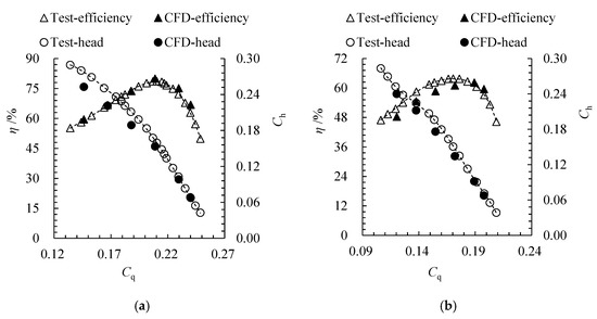 Figure 6 compares the hydraulic performance of the arc-shaped bidirectional pump based on the CFD results and test data. The head coefficient and flow coefficient can be calculated based on Equations (11)–(13). The calculated efficiency is slightly lower than the test efficiency under part-loaded conditions, but the calculated efficiency is slightly higher than the test efficiency under overloaded conditions. Under forward design flow rate, the relative error between the calculations and experiments of the efficiency and the head coefficient is 2.0% and −6.2%, respectively; under the reverse design point, those values are −4.3% and −8.5%, respectively.