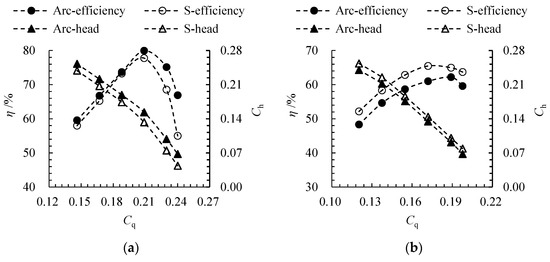 Figure 7 compares the hydraulic performance of the arc- and S-shaped cases. Under the forward condition, the efficiency and head of the arc-shaped case are higher. The highest efficiencies of the arc- and S-shaped cases are 79.9% and 77.8% respectively, and the best efficiency point for both cases can be found at Cq = 0.21. The efficiency of the two cases is close—within Cq = 0.15–0.21—but the efficiency of the S-shaped case decreases sharply from Cq = 0.21 to Cq = 0.24, which indicates that the low-camber trailing edge of the S-shaped impeller leads to strong flow separation under a large flow coefficient. Under the reverse condition, the efficiency and head of the arc-shaped case are lower. The highest efficiencies of the arc- and S-shaped cases are 62.2% and 65.5%, respectively. The best efficiency points for the arc- and S-shaped cases can be seen at C′q = 0.19 and C′q = 0.17, respectively. The results indicate that the matching degree between the arc-shaped impeller and the inlet guide vanes is poor. The high-camber leading edge of the arc-shaped impeller decreases the attack angle of the inflow and, thus, increases the best efficiency point when compared with the S-shaped impeller.