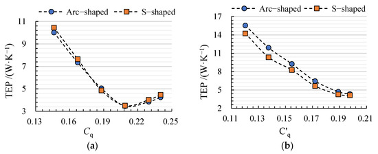 TEP distribution for arc- and S-shaped cases under (a) forward and (b) reverse conditions.