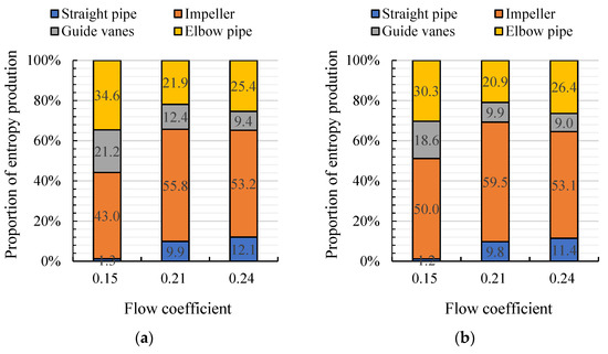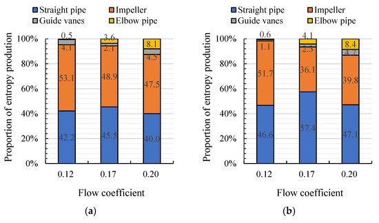Proportion of entropy production of each hydraulic component for (a) arc-shaped and (b) S-shaped cases under the forward condition.