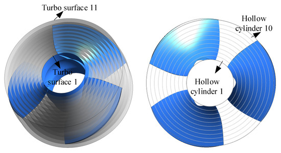 The radial coefficient R* of the turbo surface was defined as , where is the radius of the calculated turbo surface. To quantitatively analyze the TEPR distribution in different sections of the impeller passage, the turbo surface i (i = 1, 2, 3…11) was used to divide the impeller passage evenly into 10 approximate hollow cylinders, as shown in Figure 11. The radial coefficient R* of the turbo surface i could be calculated by . The inner and outer walls of the hollow cylinder i are turbo surface i and turbo surface i + 1.