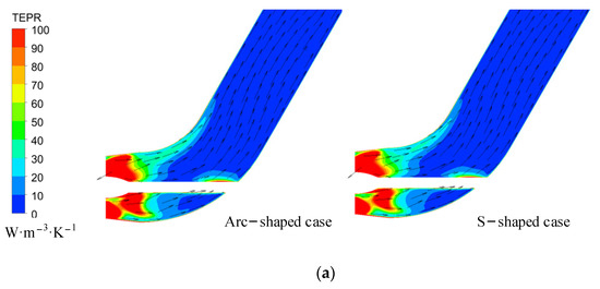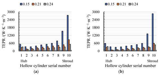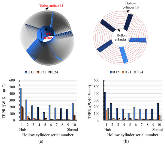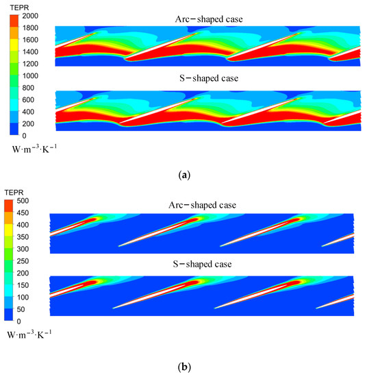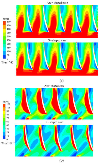 Figure 12 shows the volume-averaged TEPR of 10 hollow cylinders in arc- and S-shaped impellers under the forward condition. The average TEPR of each volume is the highest and lowest under Cq = 0.15 and 0.21, respectively. Due to the wall effect flow, the average TEPR of the volumes first increased and then declined from hub to shroud. Compared with the arc-shaped impeller, the average TEPR for the S-shaped impeller was higher from volumes 5 to 9, which led to lower efficiency. In addition, the average TEPR of volumes 9 and 10 was obviously higher than those of the rest of the volumes, due to the tip clearance leakage flow. Accordingly, the spatial distribution of TEPR in the turbo surface near the impeller shroud (R* = 0.95) was obtained, as shown in Figure 13. Under Cq = 0.15, there was a large area of high TEPR near the leading edge due to strong flow separation caused by a large attack angle, and the TEPR gradually decreased from inlet to outlet. Under Cq = 0.21 and 0.24, the TEPR distributions of the two cases were similar, and there was no obvious high TEPR near the leading edge, since the attack angle decreased with an increase in the flow rate. However, mixing of the wake vortex and the main stream led to a small area of high TEPR near the trailing edge. In addition, the area of high TEPR near suction and the trailing edge of S-shaped blade case was slightly larger than that of the arc-shaped blade case, due to the anti-arch trailing edge of the S-shaped suction side.