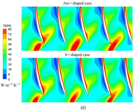 TEPR in the turbo surface of guide vanes under (a) Cq = 0.15, (b) Cq = 0.21, and (c) Cq = 0.24. (R* = 0.95).