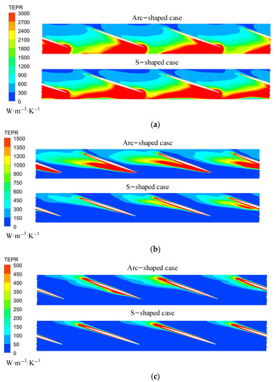TEPR in the turbo surfaces of the impeller under (a) C′q = 0.15, (b) C′q = 0.21, and (c) C′q = 0.24. (R* = 0.95).
