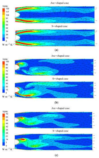 Figure 19 shows the TEPR distribution in the straight pipe under the reverse condition. Since the internal TEPR of the straight pipe is mainly affected by the velocity circulation of the inflow, the internal TEPR decreases with an increase in the flow rate. High TEPR is located near the inlet, and decreases in the flow direction. According to Figure 7 and Figure 18, the velocity circulation of the inflow and the intensity of the wake vortex of the S-shaped impeller are higher and stronger than those of the arc-shaped impeller under the same flow coefficient. Thus, the area of high TEPR is larger in the S-shaped impeller case.