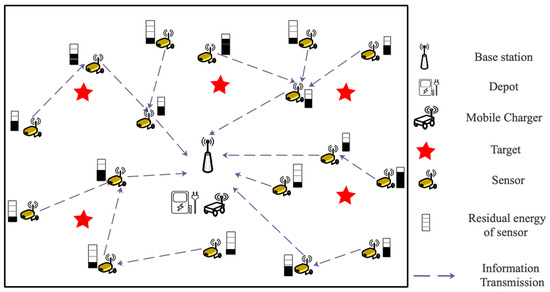 Wireless sensor networks (WSNs) have been widely applied in target tracking, environment monitoring, intelligent medical and military monitoring, etc. [1,2], which have advantages including fast construction, self-organization, fault tolerance, and low-cost deployment [3]. Meanwhile, WSNs are usually composed of a large scale of sensors deployed in an area. However, sensors in WSN are always powered by batteries, and the capacity of these batteries is constrained by the volume of the sensor, which limits the lifetime of the sensors. Furthermore, the energy constraint problem affects the quality of service of WSN directly and greatly hinders the development of WSN. In recent years, the breakthrough of wireless energy transmission (WET) technology has greatly promoted the wireless rechargeable sensor networks (WRSNs) [4], since it provides a highly reliable and efficient energy supplement for the sensors. Particularly, a promising method to overcome the energy constraint problem in WRSNs is mobile charging by employing one or more mobile chargers (MCs) with a high capacity to charge sensors via WET. The MC can move to sensors autonomously and charge them according to a mobile charging scheduling scheme, which is formulated by MC based on the status information of sensors, including the residual energy, energy consumption rate, and position of sensors in WRSN. The status information of sensors is highly controllable and predictable. Theoretically, WRSNs could work indefinitely under a well-designed charging scheme [5]. Therefore, the design of the charging scheme in WRSN is critical, and it has drawn extensive attention from the research community.