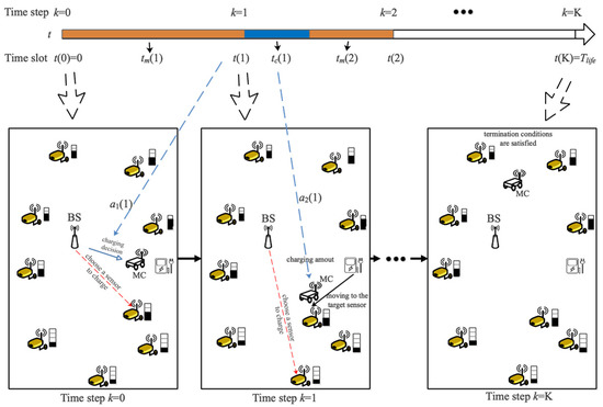 We study a joint mobile charging sequence scheduling and charging ratio control problem (JSSRC) to address the challenges mentioned above, where charging ratio is a parameter introduced to determine the charging energy for the sensor and replace on-demand charging requests with real-time changing demands. JSSRC provides timely, reliable, and global charging schemes for WRSNs in which sensors’ energy changes dynamically. Meanwhile, we propose the attention-shared multi-agent actor–critic deep reinforcement learning approach for JSSRC; this approach is abbreviated as AMADRL-JSSRC. We assume that the network deployment scenarios are friendly, barrier-free, and accessible. The transmission of information about real-time changes in energy consumption is reliable and deterministic. When the residual energy of MC is insufficient, it is allowed to return to the depot to renew its battery.