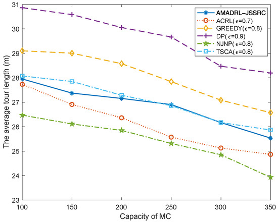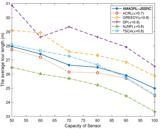 As depicted in Figure 5, NJNP has the lowest tour length, and the average tour length gradually decreases with the increase in the capacity of sensors. The reason is that with the increase in the capacity of the sensor, the number of sensors’ charging requests will decrease on the premise of sufficient residual energy. Moreover, the charging for each sensor is also prolonged due to the increase in sensor capacity. Based on the fixed baseline time, the more time the MC spends on charging sensors, the less time it will spend on moving. Therefore, the average tour length decreases gradually. The fluctuation in Figure 5 is caused by the random distribution of sensor positions and the dynamic change of their energy consumption rate in each test experiment. Furthermore, the NJNP algorithm has the lowest tour length is because it preferentially charges the sensors close to MC. It is noted that the moving distance of AMADRL-JSSRC is slightly longer than that of ACRL. This is because AMADRL-JSSRC can determine different charging ratios for the selected sensors according to the real-time charging demand to avoid the punishment caused by the dead sensors. Therefore, AMADRL-JSSRC spends slightly less time on charging than ACRL. When the base time is fixed, more time will be spent on moving, resulting in a longer moving distance.