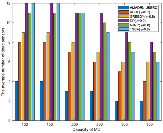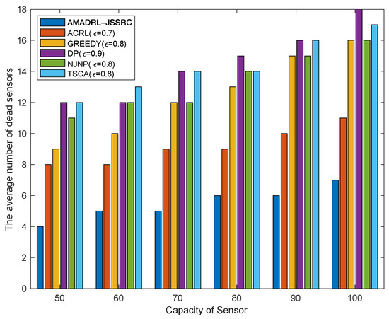 Figure 6 shows that with the increase in the capacity of the sensor, the average number of dead sensors shows an opposite change to the average tour length. Obviously, the average number of dead sensors of AMADRL-JSSRC is always the smallest. This is because the optimal charging ratios of the baseline algorithms are fixed, while the baseline algorithms are fixed. With the increase in the capacity of the sensor, the charging ratio for each selected sensor will be prolonged, increasing the risk of subsequent low residual energy sensor death. This result proves that the adaptive control of the charging ratio for each sensor could improve the charging performance effectively for the network.