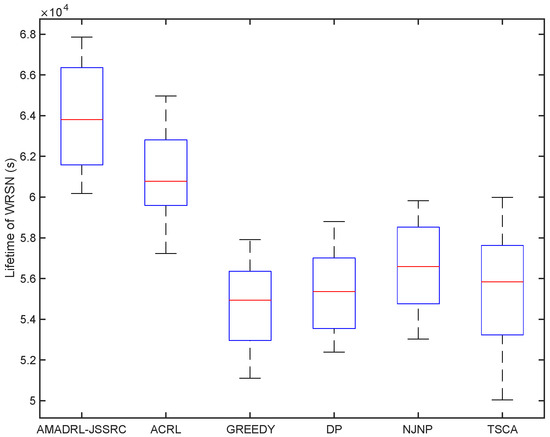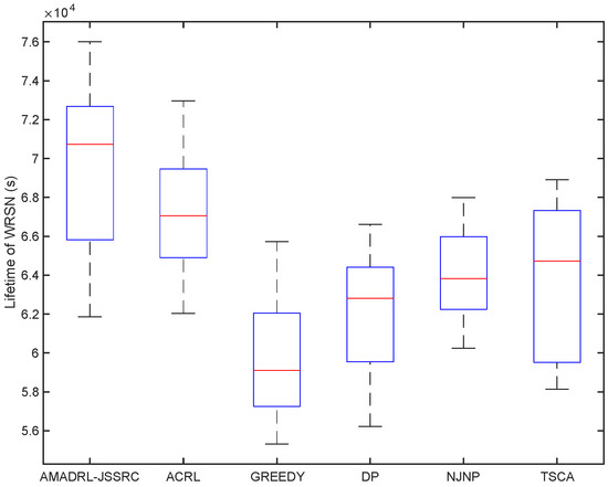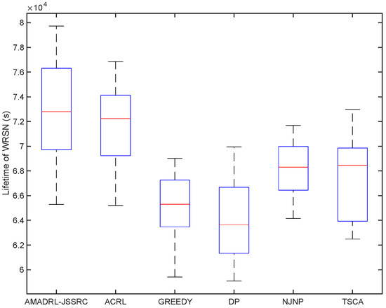 We have analyzed the test results of six schemes under the fixed baseline lifetime. In this section, we explore the lifetime of the six schemes under different JSSRCs, which are JSSRC50, JSSRC100, and JSSRC200, until the termination condition is satisfied. These six algorithms have run 50 times independently, and the test results are shown in Figure 9, Figure 10 and Figure 11. It can be seen from the figure that although the fluctuation range of network lifetime obtained by the AMADRL-JSSRC algorithm is large, the lower and the upper bounds of network lifetime are still higher than the other five algorithms significantly. Moreover, with the increase in the number of sensors, this performance is outstanding significantly. It is noted that the network lifetime obtained by the AMADRL-JSSRC is better than the ACRL, which further proves that adjusting the charging ratio adaptively for each sensor could prolong the network lifetime effectively.