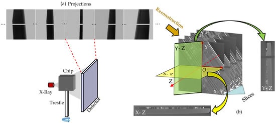 Figure 1. Chip scanning process and coordinate system. (a) Projections acquired by the detector. During the scanning process, the chip is fixed on the trestle. The trestle is rotated to obtain projections at different rotation angles. The missing data (horizontal stripe) arises from the vertical stacking of tow detectors. (b) 3D coordinate system for reconstructed data. - (3)