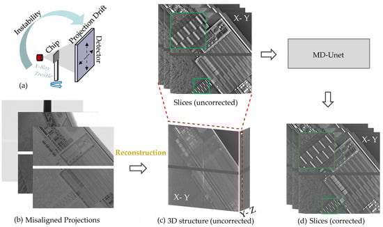 The process of the proposed correction method for laboratory nanoCT is shown in Figure 2. The causes of drift are shown in Figure 2a. The temperature inside the cabinet changes continuously during the nanoCT scan. However, the slow control of the air conditioning does not keep the temperature stable, so the drift of the X-ray source and the thermal expansion of the trestle can cause the projections to drift. The FDK algorithm [] is used to reconstruct the misaligned projections (Figure 2b). The reconstructed slices contain severe artifacts, and detailed structures cannot be distinguished (Figure 2c). The reconstructed slices with the drift artifacts are fed into MD-Unet, which suppresses the drift artifacts in the slices and produces clear results (Figure 2d).