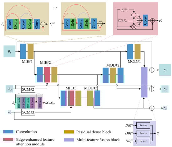Multi-feature fusion block in shallow features In the general multi-scale feature fusion, large-scale features flow into the small-scale feature, which makes the feature fusion incomplete when the cross-scale increases, resulting in feature loss. Another way is to incorporate feature fusion into the network [], but the fusion mode and the input of the decoder overlap, resulting in information redundancy. Therefore, we propose a new multi-scale feature fusion approach, which fuses the final scale information, and the outputs are a kind of mixed information so that multi-scale information can be fully integrated. We fuse the features into shallow features to output multi-scale images. The network can learn multi-scale information, and there is no waste of scale information.