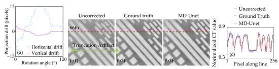 First, we test the proposed method by the simulated artifacts, and the result is presented in Figure 4. Figure 4a shows the drift added to the projections of Chip 1, which is a continuous and stable process. Figure 4b1–b3 shows the uncorrected slice, ground truth, and corrected slice of the proposed method (MD-Unet), respectively. The uncorrected slice has multi-edge due to the unaligned projections. In addition, projection truncation during scanning introduces truncation artifacts, as shown by the green arrows in Figure 4b1,b2. On the one hand, the proposed method successfully corrects the drift artifacts and faithfully maintains the slice details of ground truth. On the other hand, the convolution layers in the network have the smoothing effect on the truncation artifacts and noise of the slice. We show the 66th lines of the slice profiles in Figure 4b1–b3. The results (Figure 4c) show that the details of the corrected slice are quite close to the ground truth, and the noise in the slices (Figure 4b1,b2) is effectively suppressed.