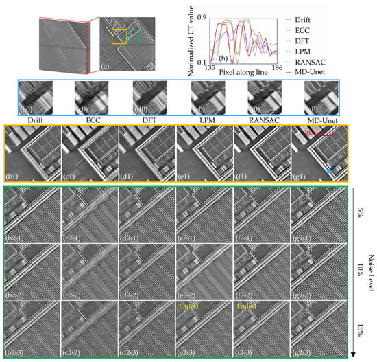 We validate the proposed method in Chip 2 with the mainstream correction methods as the comparison, and the results are presented in Figure 5. Figure 5a shows the 72nd layer (the number of layers of the silicon substrate is considered) of the reconstructed result. Figure 5b1–g1 are the local magnification of the yellow box marked in Figure 5a, and they are the uncorrected slice, the ECC-corrected slice, the DFT-corrected slice (the single-step DFT algorithm is simply represented as DFT here, and similarly in Figure 5), the LPM-corrected slice, the RANSAC-corrected slice, and the slice corrected by our method (MD-Unet), respectively. Since drifts cause projections to move randomly (left/right or up/down), slices reconstructed from the unaligned projections contain multi-edge artifacts, which are distinguished from geometric artifacts and blurring, as shown in Figure 5b1. ECC (Figure 5c1) and DFT (Figure 5d1) do not achieve the desired correction. LPM and RANSAC eliminate the SURF outliers and achieve accurate corrections using valid projection features; their results (Figure 5e1,f1) show sharp edges and clear structures. The proposed method (Figure 5g1) successfully corrects for drift artifacts, and the correction results are as clear as those of the SURF variants (Figure 5e1,f1). However, we find that the traditional correction methods could not completely correct the drift artifacts, especially the details (marked by the blue arrow in Figure 5g1). To clearly show the detailed information of the slice, we enlarge the area marked by the blue arrow, and the results are shown in Figure 5b0–g0. The results indicate that drift artifacts make the relationship of components in the chip difficult to discern, which is very important in industry. Although LPM and RANSAC perform well in the overall correction, they are insufficiently processed in the detail part. The proposed method achieves the clearest results. Further, the local profile of the reconstructed slice, which is marked in Figure 5g1, is used to assess the correction effect. The profiles (Figure 5h) show that the DFT achieves a limited correction result, and the ECC even makes the details more indistinguishable. The profile of the proposed method is close to that of the SURF variants. It is worth noting that the proposed method does not require additional scanning, which means that the proposed method saves at least 1500 s (the time of addition scanning).