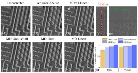 Figure 6 shows the correction results for Chip 3. The uncorrected result (Figure 6a1) shows a low-resolution result, which is extremely serious because the connections of the various parts of the chip cannot be identified. Compared with the uncorrected slice, the result of DeblurGAN-v2 (Figure 6a2) is improved, but the structure and connectivity of the chip are still unclear. MIMO-Unet achieves a clear result on the overall structure, but the details are blurred. The proposed method handles the details well, especially MD-Unet+ (Figure 6a6), which achieves the sharpest result. The proposed method directly corrects 2D slices of the chip. Figure 6b shows the side of Chip 3, 10 slices containing useful information, and the other layers on the side are silicon substrates (Figure 6c). Further, we evaluate the corrected slices by image quality metrics. The energy of gradient (EOG) and Vollath function are considered. EOG contains the gradient information of the image, which is represented as:
