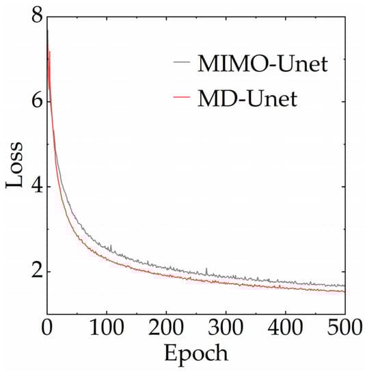 In addition, we evaluate the advantages of the proposed framework by recording the losses during the training process (500 epochs), as shown in Figure 7. Here, both MIMO-Unet and MD-Unet use the proposed multiscale mixed loss (Section 3.2). The results show that MD-Unet has a lower loss.