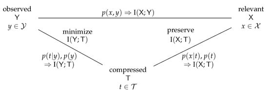 The information bottleneck method is a quite generic information theoretical setup that was introduced by Tishby et al. in []. The basic setup consists of three discrete random variables , and with realizations and . These variables follow the Markov relation and interact as illustrated in Figure 1 and explained in the following.