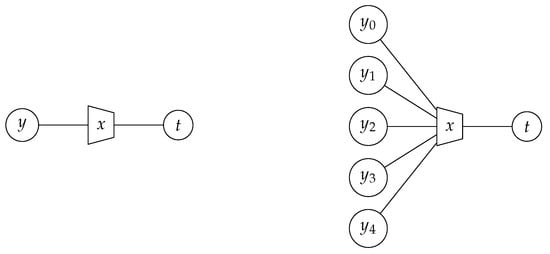 Information bottleneck graphs are extended factor graphs that aim to compactly visualize the intended mutual information relations of the information bottleneck method. In an information bottleneck graph, a compression mapping designed with an information bottleneck algorithm is visualized as a trapezoid node that is labeled with the respective relevant random variable. The compressed variable is connected to the shortest side of the trapezoid. The other connected variables form the observation. This concept allows one to cover compression mappings with a single scalar input y or multiple scalar inputs . Figure 3 shows an example for a compression mapping with one scalar input on the left. On the right of the figure, an example for a compression mapping with five scalar inputs is shown. A compression mapping with N scalar inputs can equivalently be seen as a compression mapping for a row vector . In this case, the observed random variable is a random vector, but the principle of the information bottleneck method remains unchanged, and the compression mapping can still be designed with the available information bottleneck algorithms. Problems arise, however, for a large number of inputs N, as the number of possible conditions might grow massively with N. Nonetheless, Figure 3 illustrates that the intended information relations can be visualized very compactly in information bottleneck graphs. Information bottleneck graphs will be used extensively in Section 2.3.