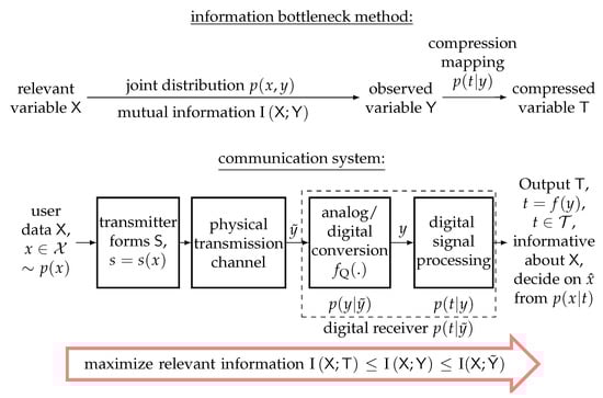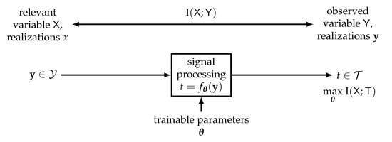 Interestingly, the concept of a relevant random variable was also introduced by Tishby et al. in [] in a very generic information theoretical setup termed the information bottleneck method. Conceptually, this method is not directly linked to the communication problem considered above. The elementary idea of the information bottleneck method is to compress an observed random variable to a compressed variable using a compression rule. The compression rule is tailored to preserve relevant mutual information I, where I. In this problem formulation, is a chosen random variable of interest. This variable defines which features of the observation are relevant and should be preserved under the invoked compression. Hence, this concept can be understood as defining relevance through another variable []. The information bottleneck method already has numerous very successful applications, such as in image and speech processing, astronomy and neuroscience [,,,]. A comprehensive tutorial on the information bottleneck method, its applications in source coding and its connections to inference and representation learning problems can be found in []. In addition, a survey on the applicability and usefulness of the information bottleneck for machine learning is provided in [].