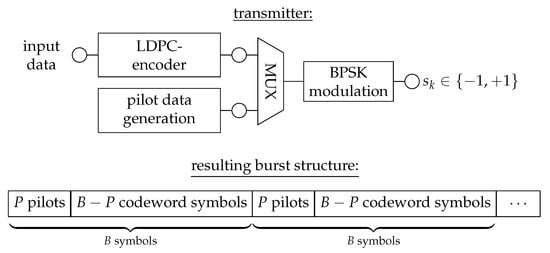 The transmitter transmits codewords from a regular LDPC code with a codeword length over the channel using BPSK modulation. In order to simplify the receiver-side detection and decoding, the transmitter multiplexes P known pilot symbols into a transmitted codeword with a distance of symbols such that each block of B symbols weighted with the same channel coefficient starts with a few known pilot symbols. The resulting burst structure is also sketched at the bottom of Figure 5. These pilots shall serve as a reference signal to enable a simple receiver-side channel estimation.