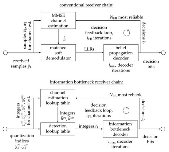 Conventional and information bottleneck receiver chains for LDPC-encoded data transmission over a frequency-flat fading channel. The conventional receiver uses quasi-continuous received samples with double-precision and processes them in state-of-the-art detection and decoding algorithms. The information bottleneck receiver works on quantization indices and implements all signal processing using information bottleneck lookup tables.