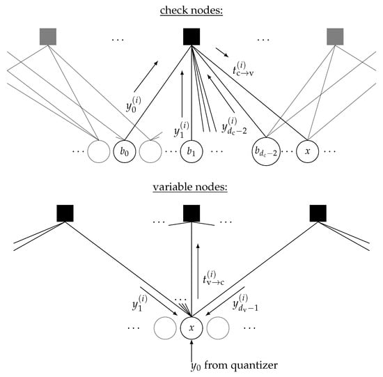 - Stark, M.; Lewandowsky, J.; Bauch, G. Information-optimum LDPC decoders with message alignment for irregular codes. In Proceedings of the 2018 IEEE Global Communications Conference (GLOBECOM’2018), Abu Dhabi, United Arab Emirates, 9–13 December 2018; pp. 1–6. [Google Scholar]